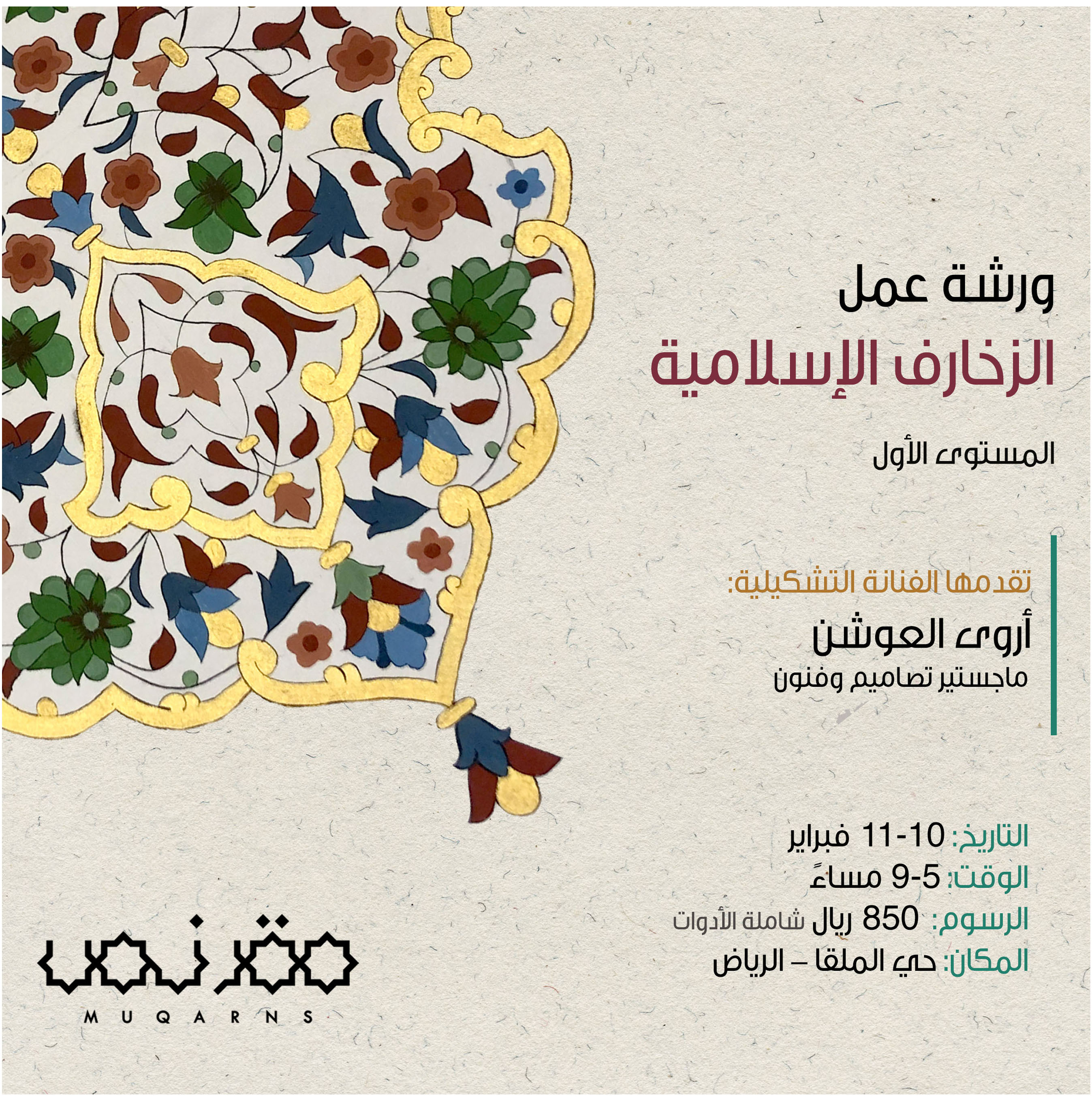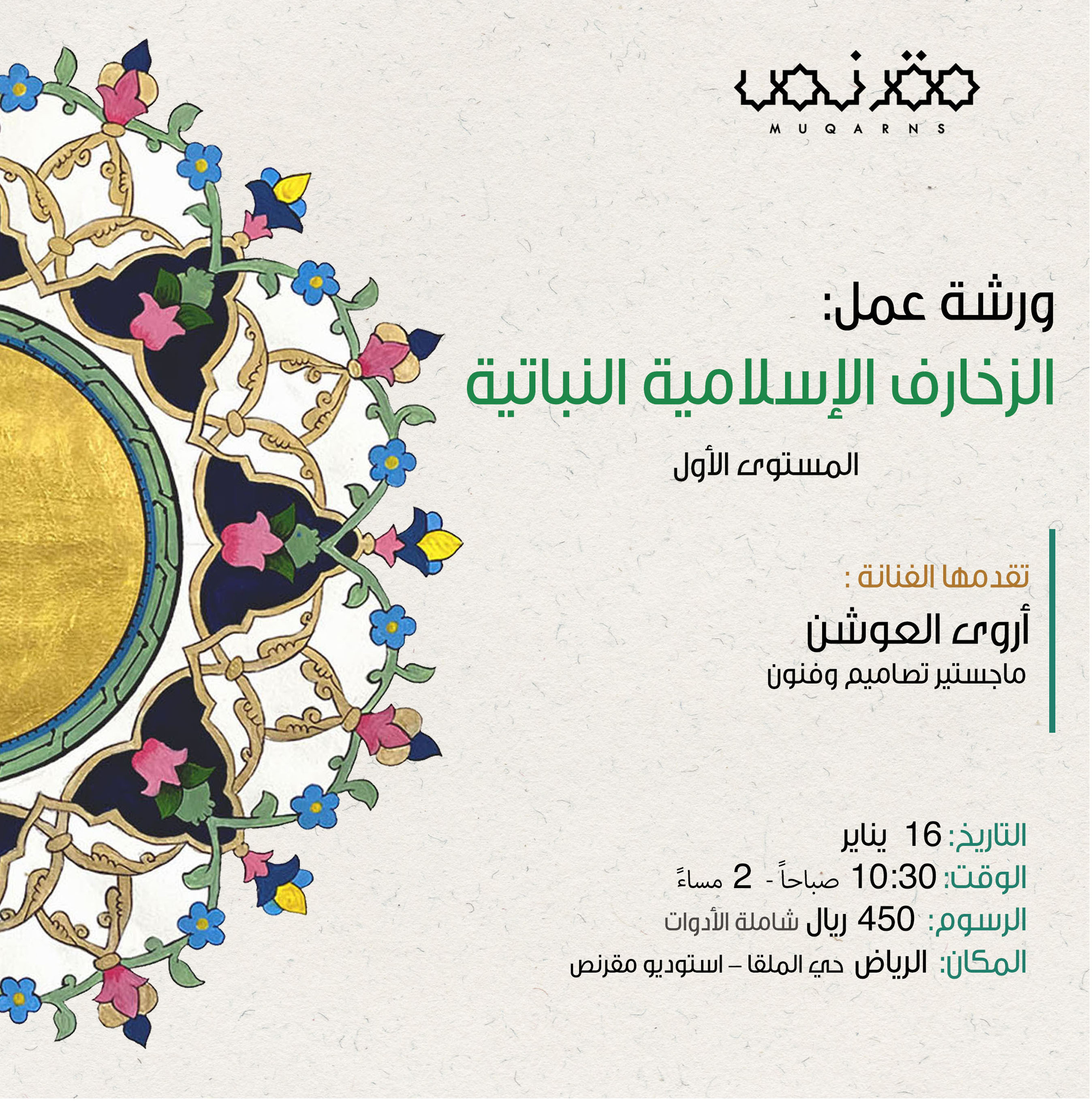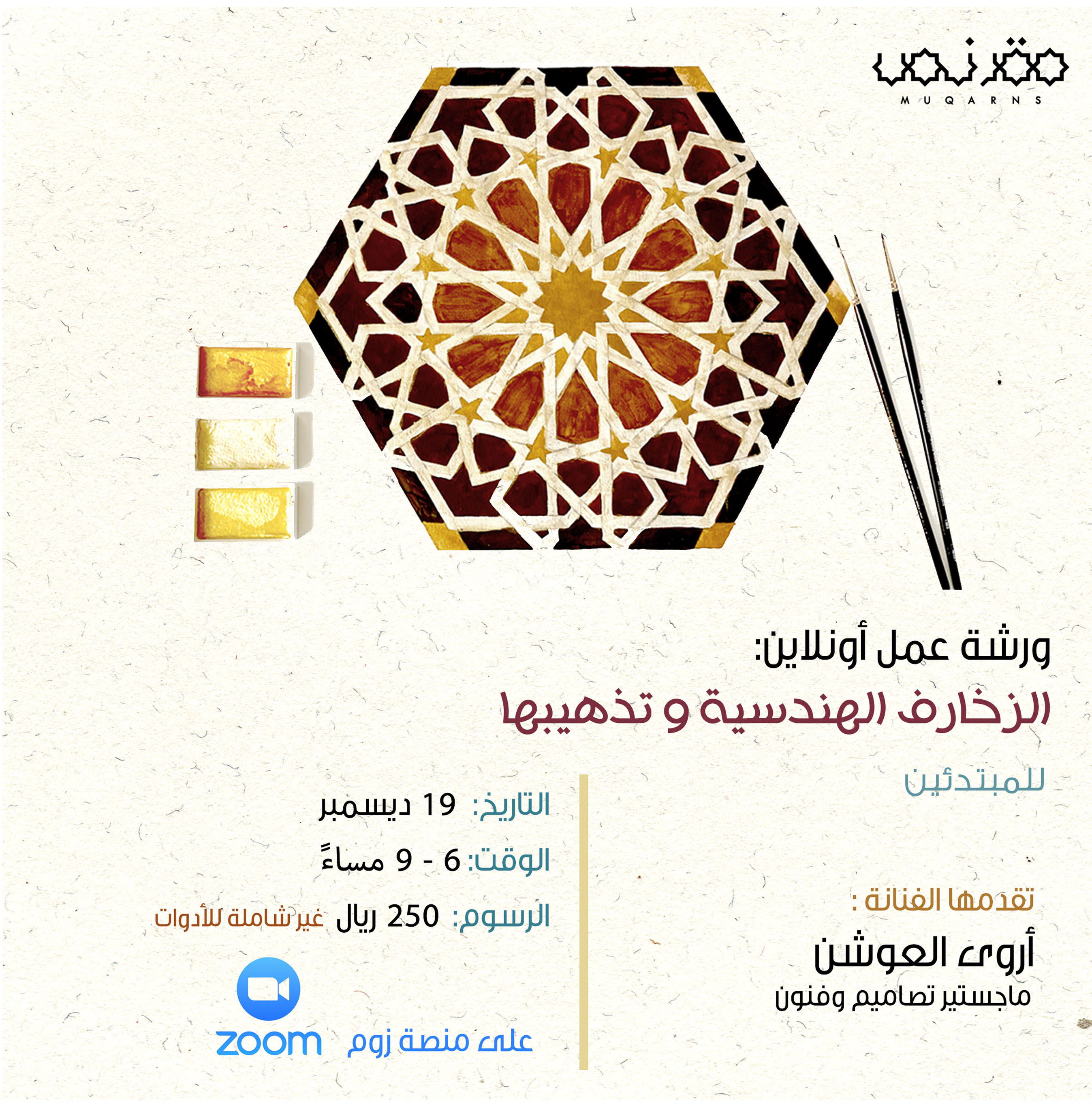 أونلاين | على منصة زوم zoom محاور الورشة: 1-مدخل للزخرفة الإسلامية وأنواعها. 2-فلسفة الزخرفة الهندسية وأبعادها. 3-أساليب التذهيب في الزخارف الإسلامية. 4-تكوين وحدة زخرفية هندسية. التاريخ: 19 ديسمبر الوقت: 10:30 صباحاً - 2ظهراً الرسوم: 450 ريال شاملة للأدوات
